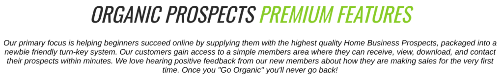Organic Prospects delivers 70 to 140 fresh high quality new leads a day using a lead generation service. It is built around the idea of delivering quality prospects (i.e. potential buyers) to members in an “organic” fashion.